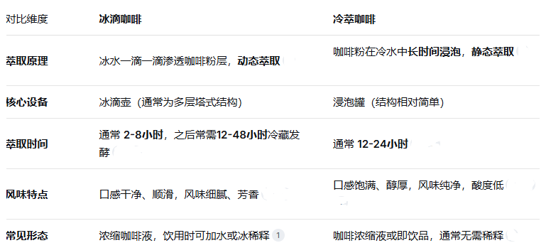 冰滴咖啡和冷萃咖啡都属于低温慢速萃取的咖啡,能带来比热咖啡更柔和、更甘醇的风味体验。不过,它们在制作原理、所需设备和最终风味上都有区别。下面这个表格能帮你快速了解它们的核心差异: